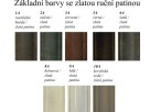 Výsledný design vaší postele si můžete nakombinovat z 10 barev kovů, na které může být následně ručně nanášena zlatá nebo stříbrná patina. Dřevěné nohy z masivního dubu nabízíme v 7 odstínech.