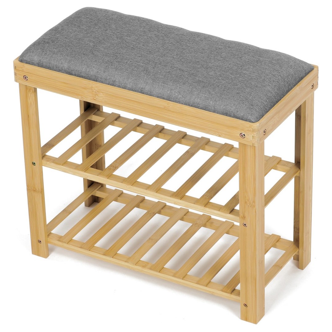 Tento elegantní botník kombinuje skandinávský styl s praktickým designem. Vyroben z masivního bambusu v přírodní barvě, nabízí dvě prostorné police pro vaši obuv. Horní polstrovaná sedací plocha v šedé barvě poskytuje komfort při obouvání.