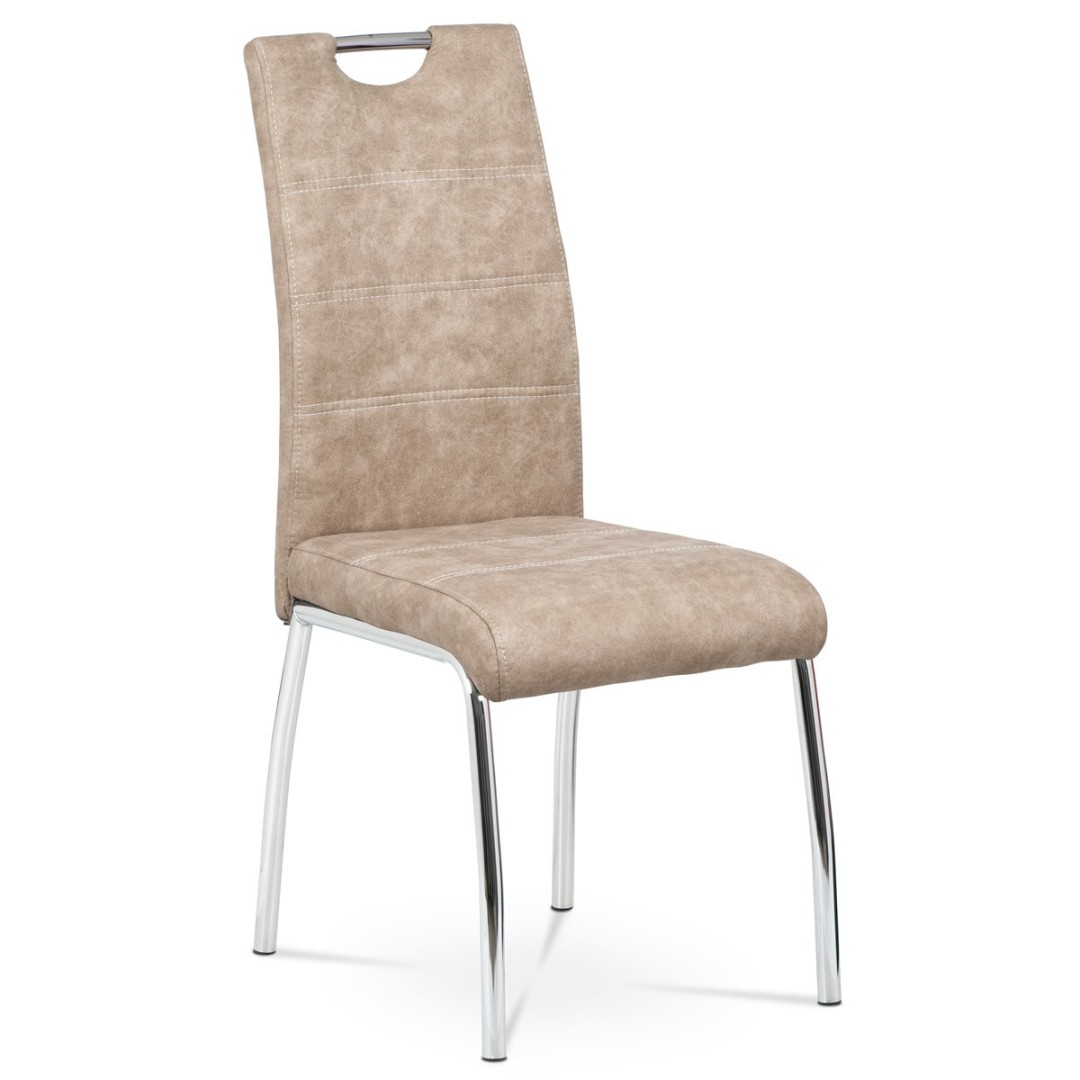 Moderní jídelní židle je čalouněná krémovou látkou COWBOY v dekoru vintage kůže s dekorativním bílým prošitím sedáku i opěráku.