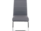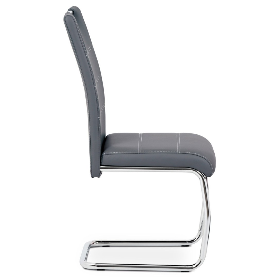 Moderní jídelní židle je čalouněná šedou ekokůží s dekorativním bílým prošitím sedáku i opěráku.