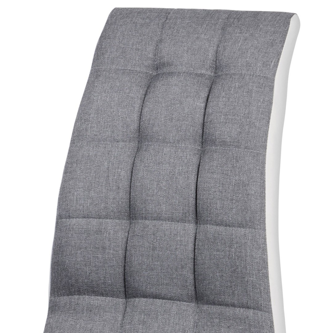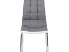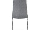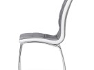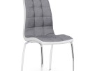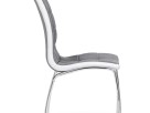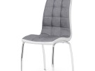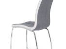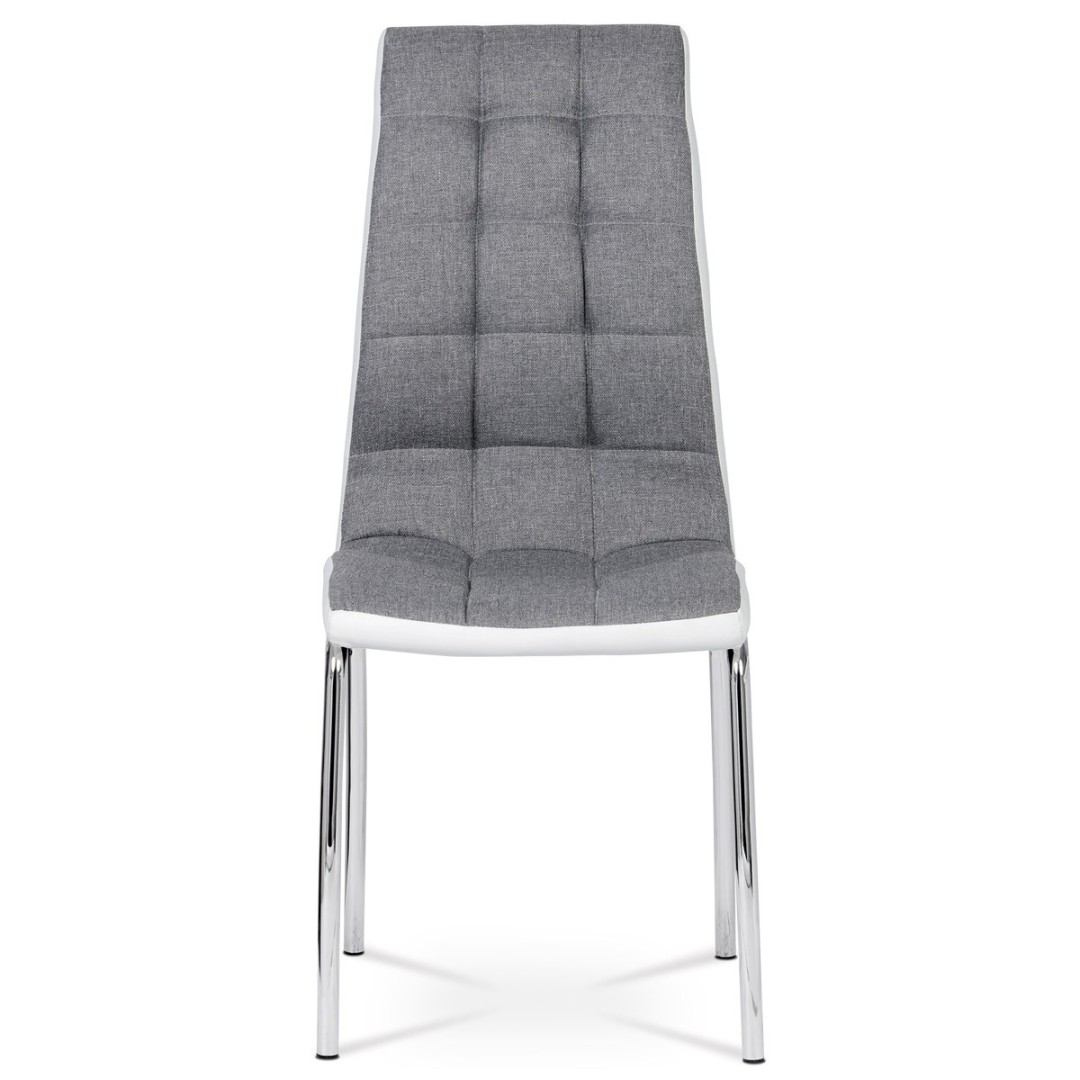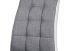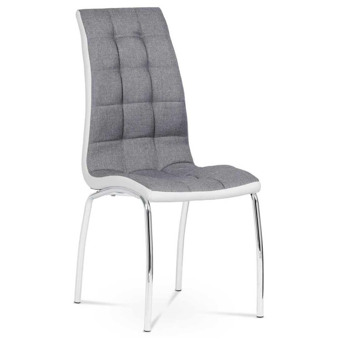 Jídelní skořepinová židle s vyšším ergonomickým opěradlem je potažena středně hrubou látkou v šedém odstínu doplněnou bílou ekokůží na bocích a čelní straně sedáku. Výrazným prvkem je dekorativní čtvercové prošití čelních ploch skořepiny s nápadnými čalounickými vtahy. Polstrování je z kvalitní PU pěny.