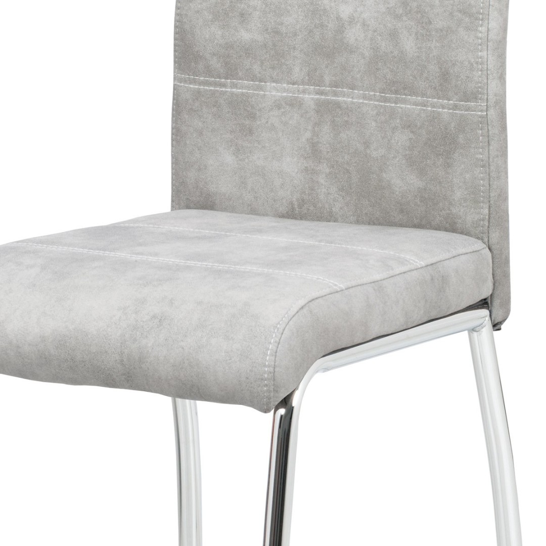 Moderní jídelní židle je čalouněná stříbrnou látkou COWBOY v dekoru vintage kůže s dekorativním bílým prošitím sedáku i opěráku.
