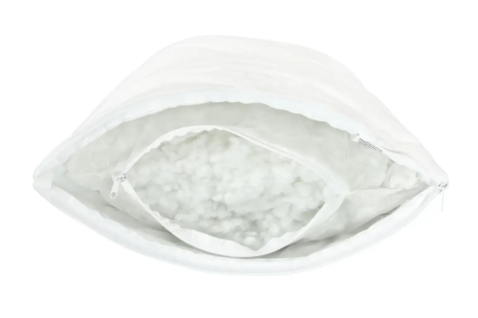 - Prošitý polštář s klimatizační vrstvou, díky které drží lépe tvar, je opatřen na boční straně dlouhým zipem a vyjímatelnou vložkou s náplní též na zip. Povlak polštáře bez náplně lze častěji prát.