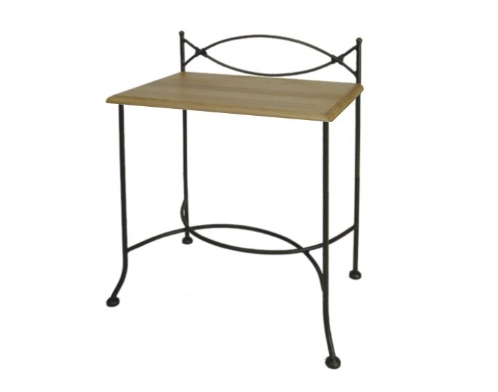 Noční stolek s dřevěnou deskou a kovanými detaily v designu postele Tholen, aby vám vše hezky ladilo.