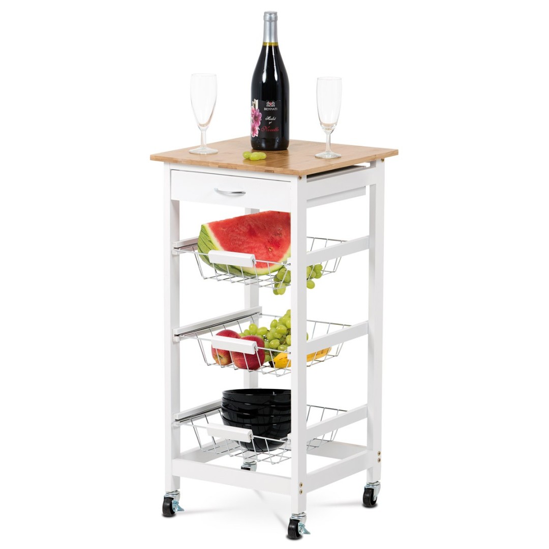 Krytý úložný prostor tvoří jedna menší zásuvka s chromovaným madlem. Zde je možné uložit příbory či drobné kuchyňské předměty, popř. jako skryté místo na sladkosti. Koše jsou svařené z kovových drátů a chromované. Velikost bambusové desky je 37 x 37 cm, což je příjemné zvětšení kuchyňské plochy a navíc mobilní.