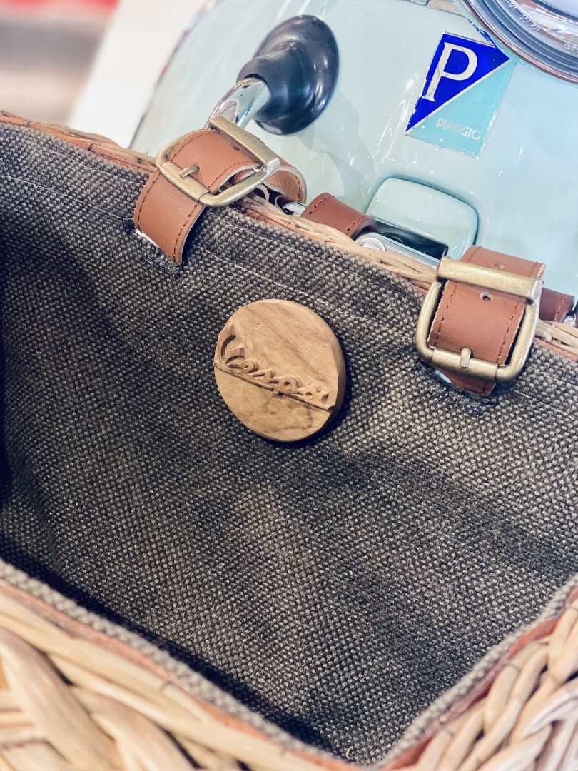 Vnitřek košíku je obšitý kvalitní látkou, která je přichycena suchým zipem. Součástí jsou tři kožené pásky a odnímatelné kulaté logo z teaku VESPA.